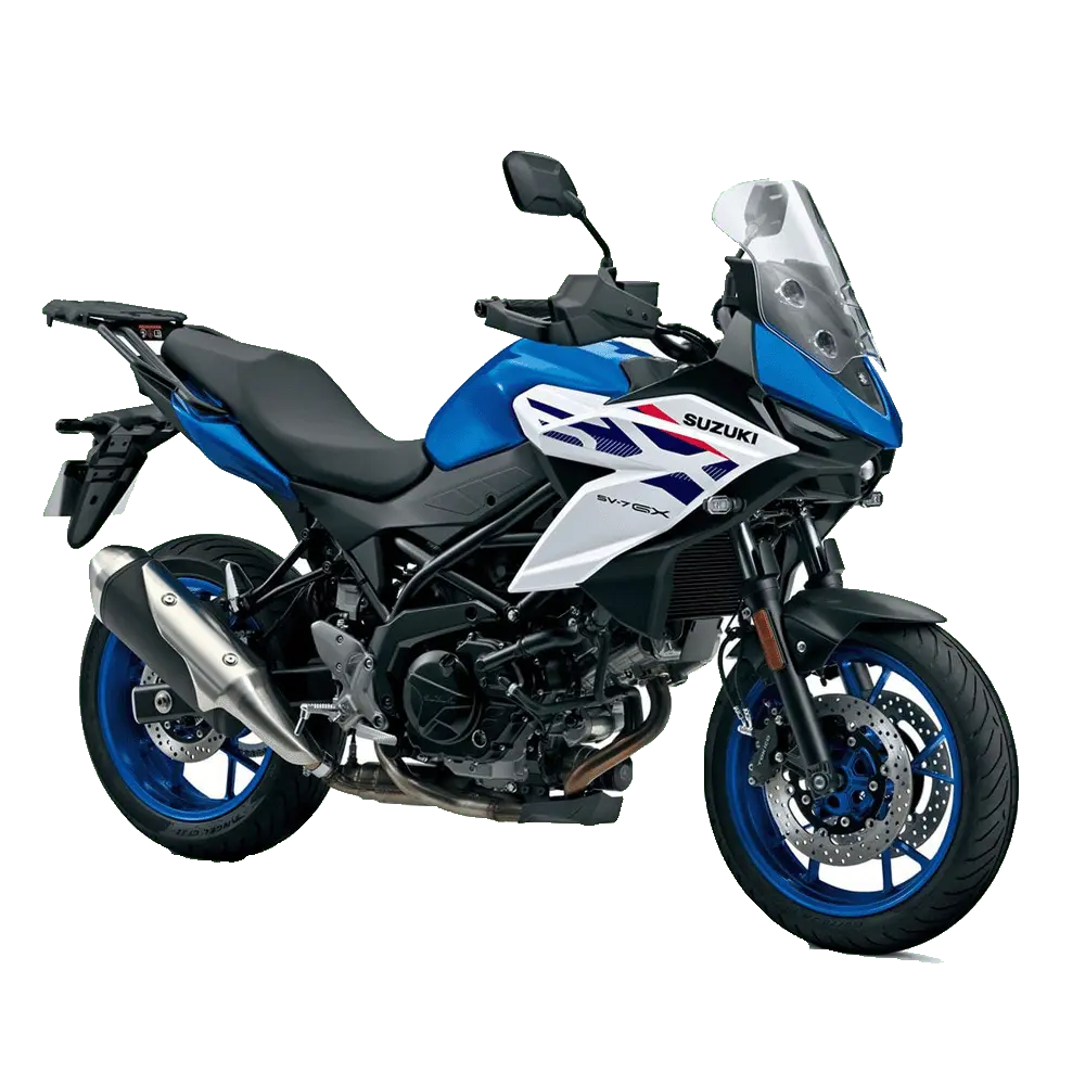 Was die SV-7GX spannend macht: Sie setzt nicht auf einen völlig neuen Motor, sondern auf eine bewährte Basis. Genannt werden: 645 cm³ V2, ca. 73 PS / 54 kW und 64 Nm (je nach Quelle leicht unterschiedlich dargestellt, aber im Kern in diesem Bereich) Die Positionierung ist eindeutig: aufrechte Sitzposition, Windschutz, Alltag + Tour, aber mit 17-Zoll-Straßenrädern – also eher “Road-Crossover” als “Enduro light”.